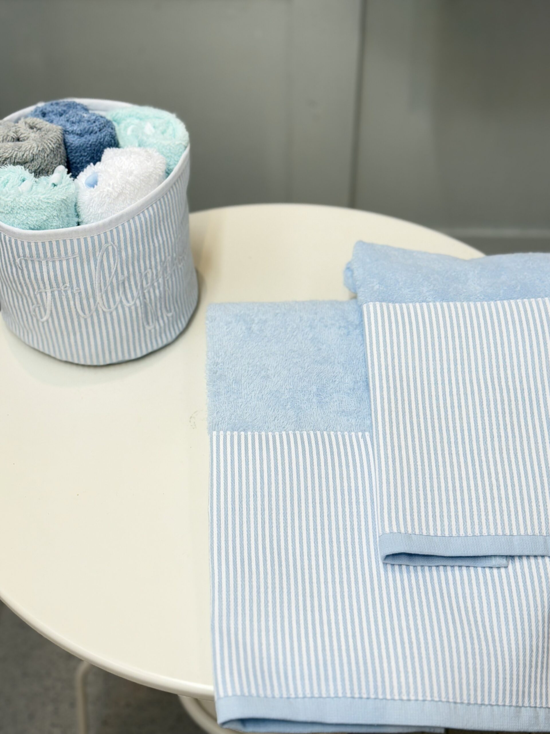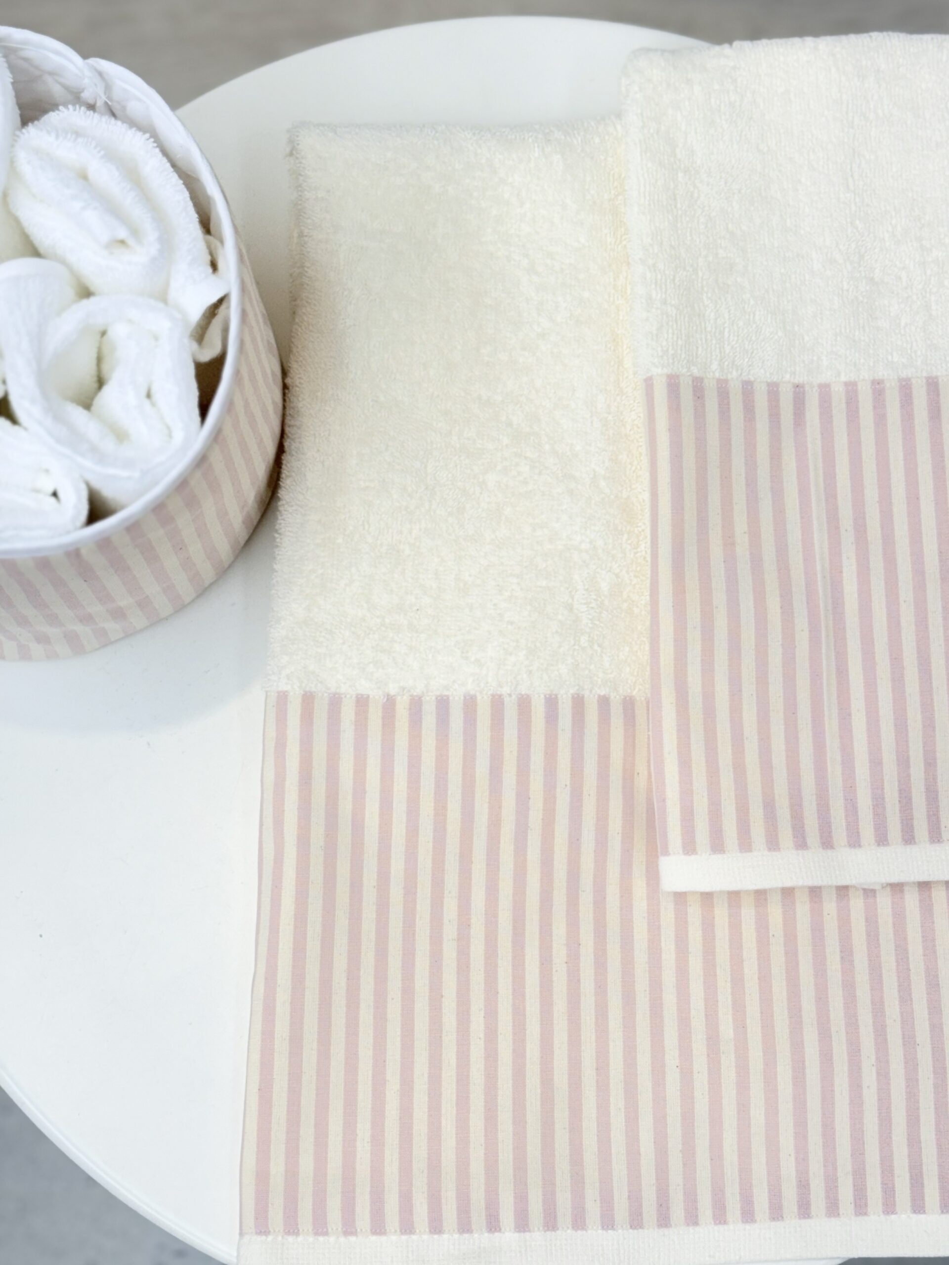 Coppia di asciugamani con balza a righe personalizzabile con ricamo in corsivo tono su tono