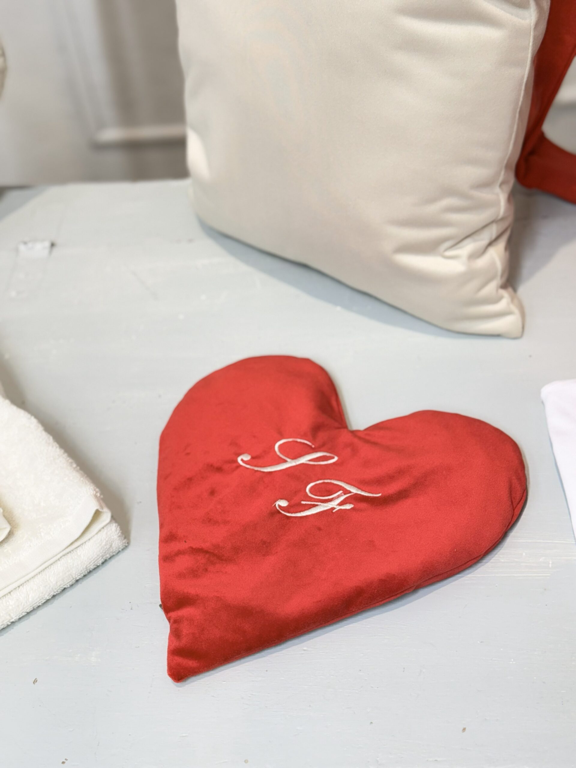Cuscino in velluto rosso a forma di cuore personalizzabile con iniziali o nome in corsivo panna