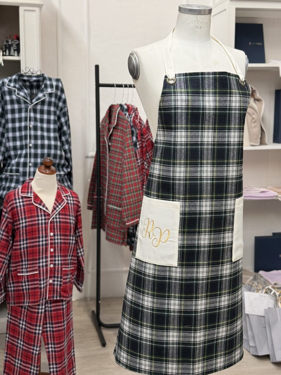 Grembiule doppia tasca in fantasia tartan personalizzabile con iniziali in corsivo color Oro