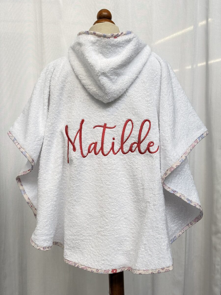 Poncho in spugna bianco con bordo fantasia e ricamo sulla schiena